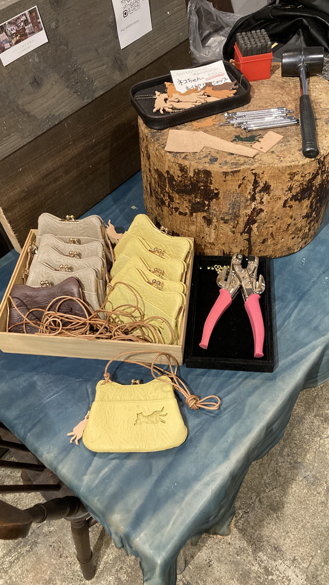 ハトメ(穴開け金具)を付けて革ひものショルダーをセット。
